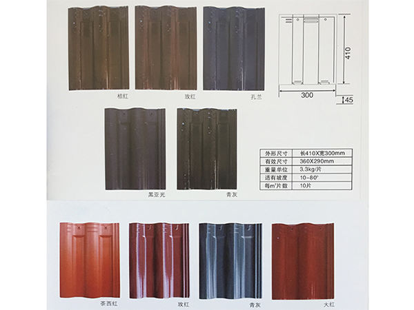 名稱:陶瓷彩瓦 顏色:玫紅、孔綠、孔藍、硒紅、深青灰、青灰、亞光、灰藍等(可定制顏色) 尺寸:370*250mm 405*270mm 厚:10mm 每平米用量:14片 鋪貼方式:水泥屋面鋪貼,木、鋼結(jié)構(gòu)干掛都可以 吸水率 : <6% 抗凍性能:-25 產(chǎn)地:江蘇宜興市丁蜀 安徽宣城廣德縣